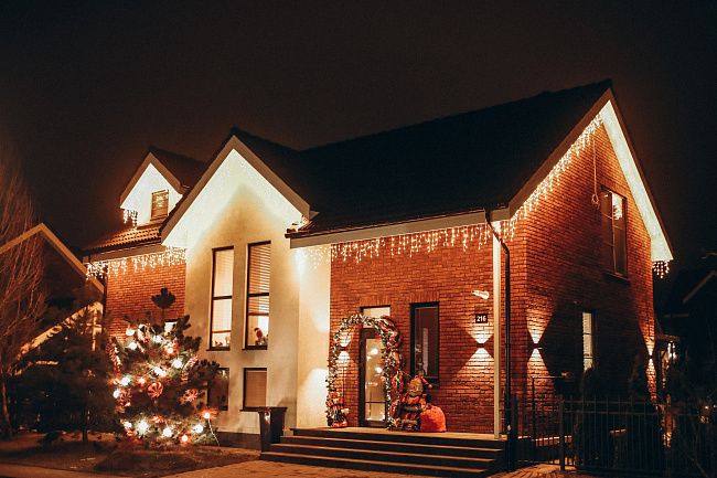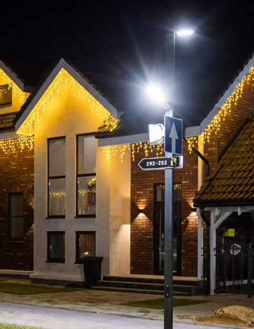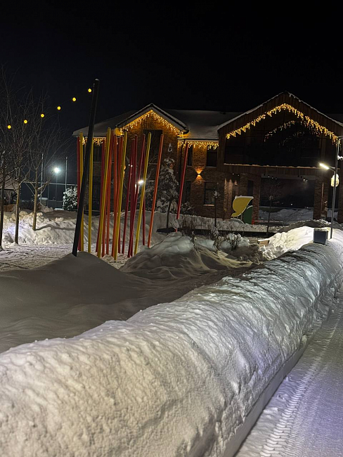 Освещение дорог, зданий и зеленых зон гармонично сочетается с элементами благоустройства поселка